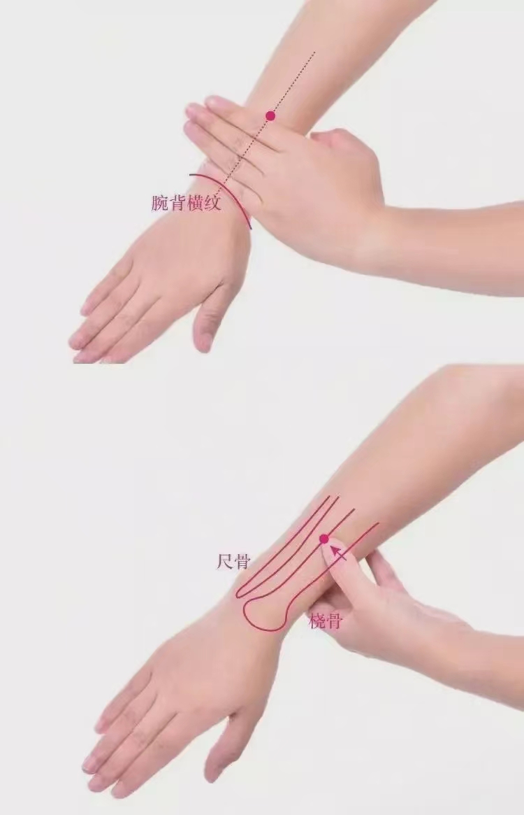 04.【取穴方法】:伸臂俯掌,于手背腕横纹中点直上3寸,尺骨与桡骨之间,与相对取穴。