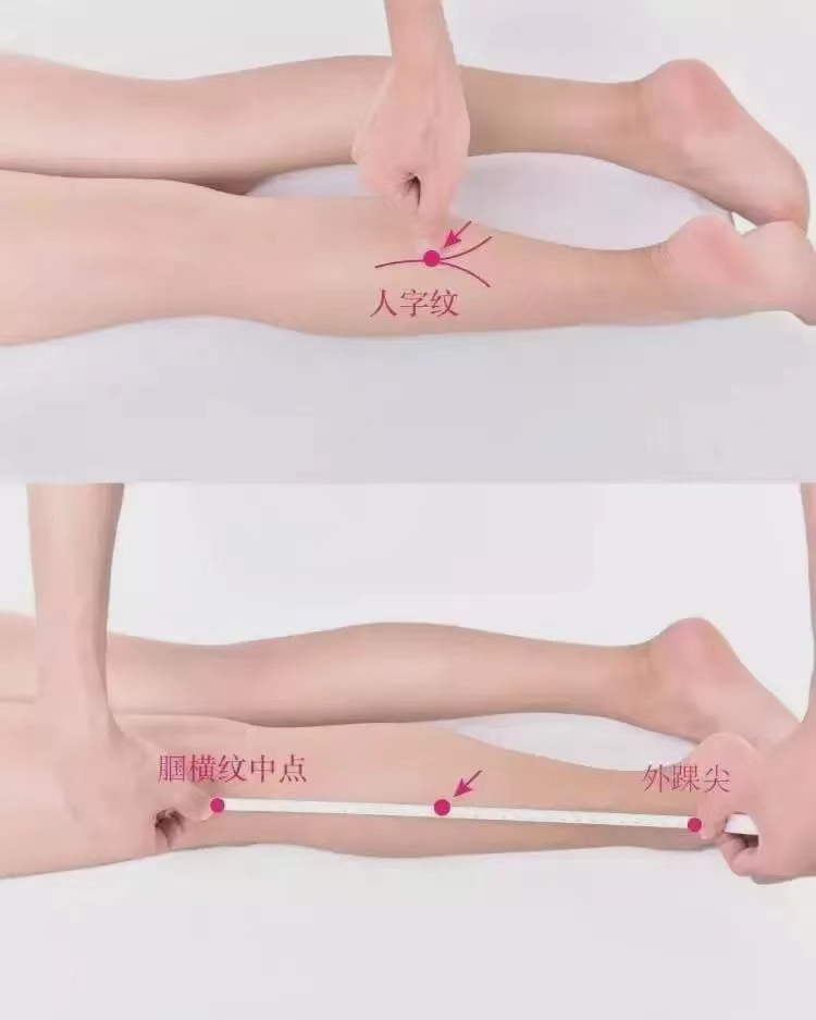 05.【取穴方法】:承山穴在小腿被测正中线上,伸小腿或上提足跟时,可以看到在小腿背侧中间肌肉(排肠肌)收缩时会形成一个人字形的分叉,承山穴就在这个人字形沟的顶点处。