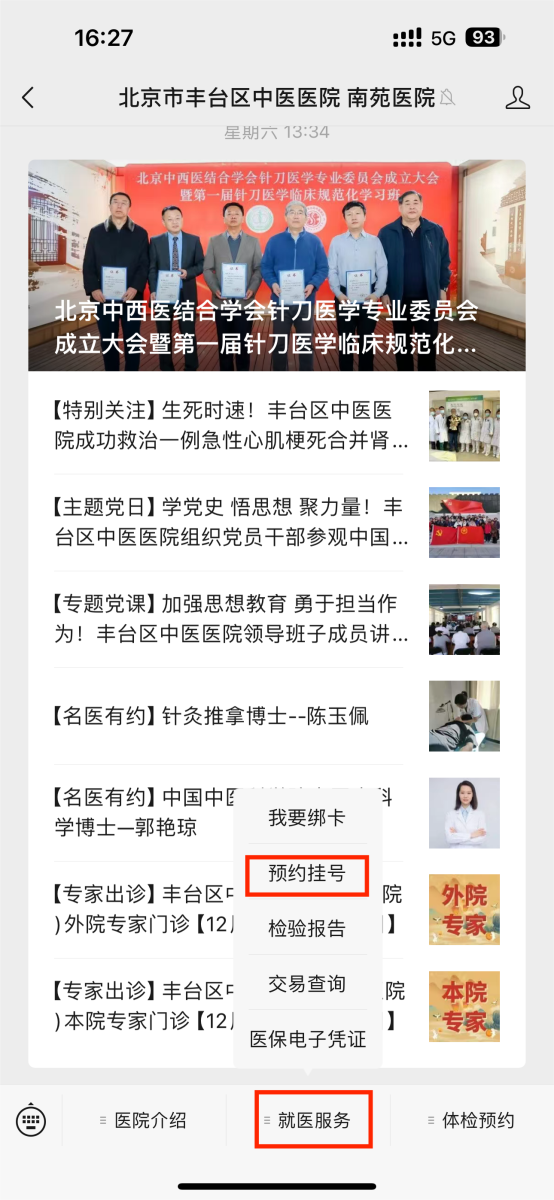 关注微信公众号【北京市丰台区中医医院(南苑医院)。微信公众号,依次点击下方【就医服务】→【预约挂号】,选择科室、日期、医生类型,进行预约,可以预约7天之内的号源,预约成功后会收到微信提示消息。
