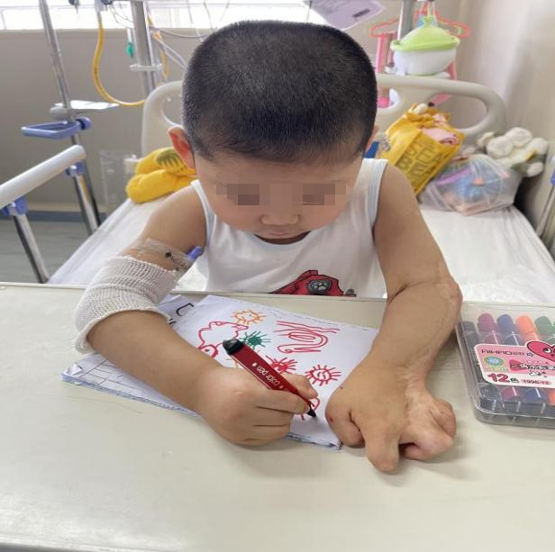 初到病房,本就敏感的孩子对一切都十分抗拒,哭闹不停。为了孩子能顺利地接受治疗,由烧伤科医护团队、静疗小组等多学科紧密协作,制定了全面的个性化护理及治疗方案。考虑到反复穿刺会给沐紫小朋友带来痛苦,主治医师邀请我院静疗小组对患儿进行会诊,经过静疗小组缜密地分析讨论,最终决定给沐紫小朋友置入中线导管。静疗护士克服孩子小、哭闹不配合等困难,利用精湛的置管技术,顺利地将中线导管置入患儿体内。保证了患儿能及时精准地接受药物治疗,为尽快康复打下了良好的基础。